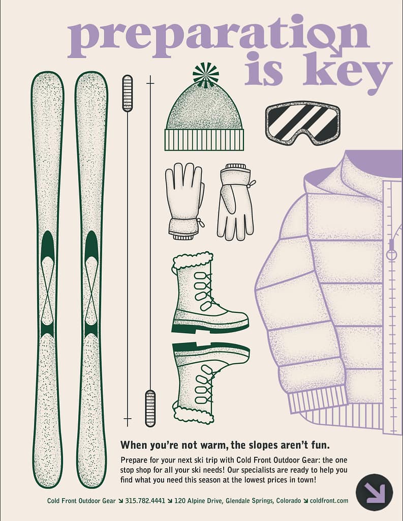 The goal of this project was to design two completely different brands from the same phrase. “Cold Front” is intriguing because it could be a business that operates in hot or cold weather. Cold Front Outdoor Gear is a ski shop in Glendale Springs, Colorado which specializes in winter gear and sporting goods. Cold Front Creamery and Cafe is an ice cream and coffee shop in Buffalo, NY. Each of the brands are vastly different and unique, despite having the same name.